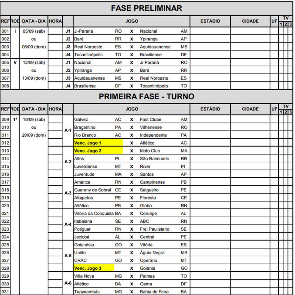 Os quatro vencedores desses confrontos entram nos grupos da primeira fase. O vencedor de Ji-Paraná x Naciona FC entra no grupo 1. O vencedor do confronto Baré (RR) x Ypiranga-AP fica no grupo 2. Quem ganhar no jogo do Real Noroeste (ES) e Aquidauanense (MS) entra no grupo 5. E o vencedor de Brasiliense (DF) x Tocantinópolis (TO) fica no grupo 6.